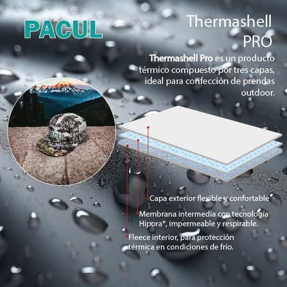 Para la fabricación de el Gorro Pacul, utilizamos la tela impermeable Thermashell de 3 capas. Esta tela presenta una capa superior de un aspecto elegante, una capa intermedia con una membrana Impermeabilidad y Respirable, y una tercera capa de forro muy delgado polar que sirve para proteger de la membrana y dar cuerpo a la tela.